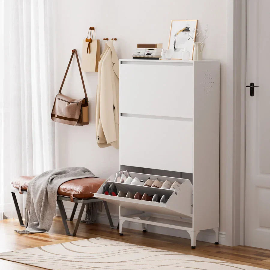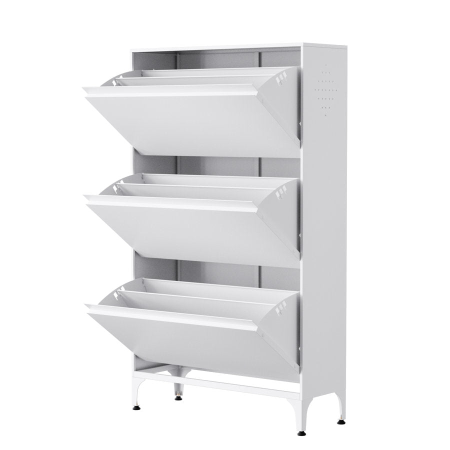 Organisera din entré med elegans tack vare detta smarta skoskåp som rymmer upp till 24 par skor och utnyttjar det tillgängliga utrymmet optimalt. Detta geniala skoskåp har tre rymliga, lutbara lådor, vardera med två rader, vilket ger gott om förvaring och intelligent utnyttjar vertikalt utrymme. Dess moderna design med kallvalsad stålram smälter harmoniskt in i alla miljöer, vare sig det är en hall, garderob, garage eller ett smalt studentrum.